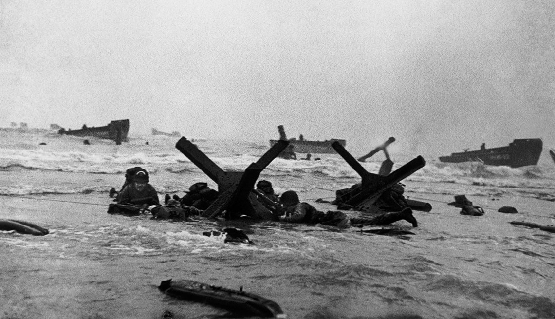 One of the examples he often cites of the “greatest war photographer’s” lack of war photographer talent is the fact that the pictures taken in the water by Capa show men clustered around obstacles, and not gun emplacements on the beach. He points out that these pictures were taken looking out to sea, not inland to the beach, to the action. He maintains that these just are not good combat pictures.