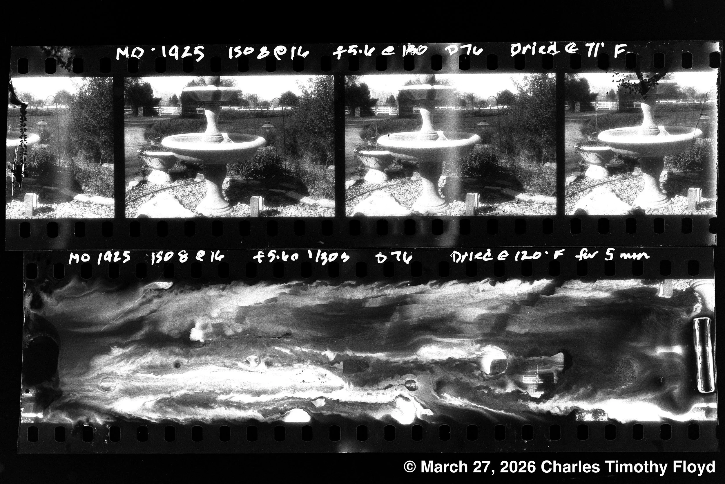 I did several things with this film, but to cut to the most important part, I exposed the film and developed it in D-76, which was a common developer at that time. While wet, I hung one strip in a shower at 71-degrees F and placed the other strip in an oven set at 120-degrees. The first strip dried normally. The emulsion on the second strip began to melt after about two minutes. The entire strip did not begin melting all at once but it went from normal to melting very quickly. Here are the two strips, with the bottom strip from the oven.